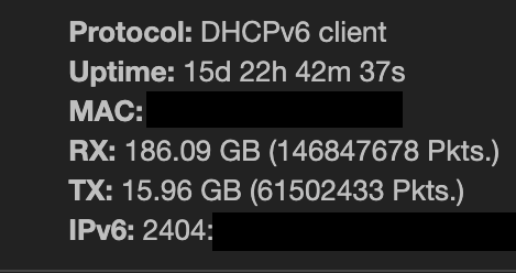 IPv6 が接続されている場合、WAN6 インタフェースにこの様な IPv6 アドレスが表示されていると思います